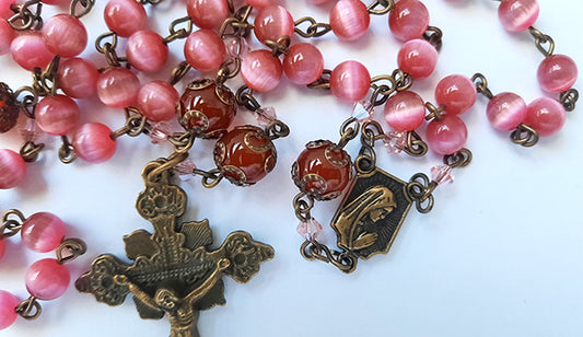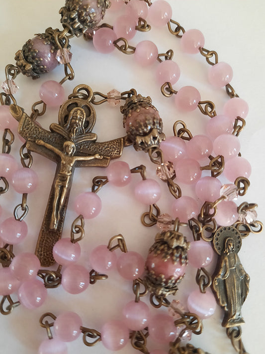 Rosary Glass Pink Cats Eye Beads - Bronze
