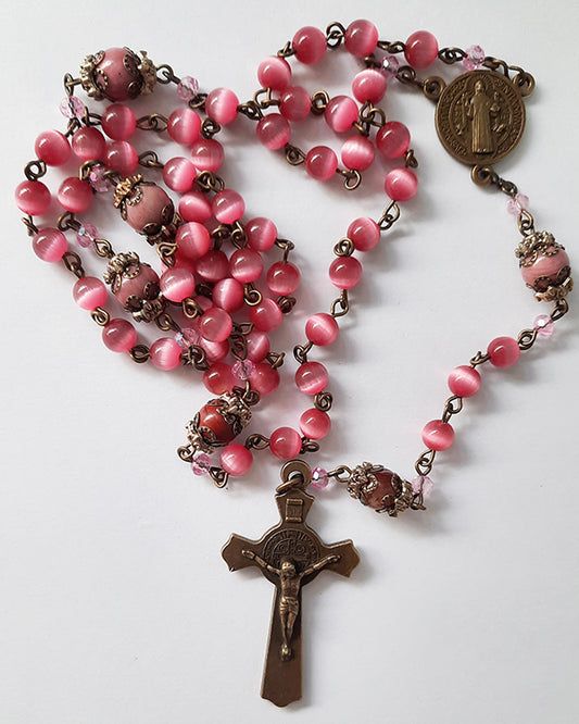 Rosary, Saint Benedict, Dark Pink Cats Eye Beads