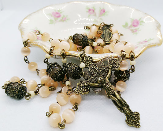 Rosary 6mm Peach Cats Eye Beads - Bronze