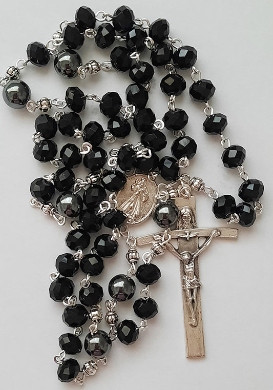 Rosary - Black Glass Crystal Beads - Trinity Crucifix