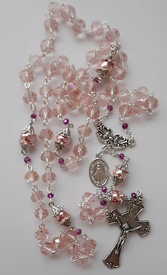Pink Rosary - 6x8mm Pink Glass Crystal - Pink Hematite Beads