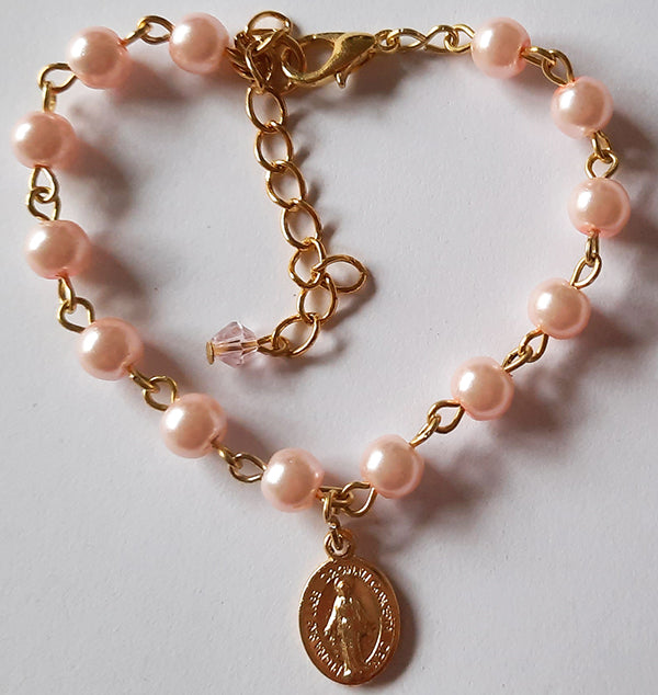 First Holy Communion Bracelet - Pink Glass Pearl Beads
