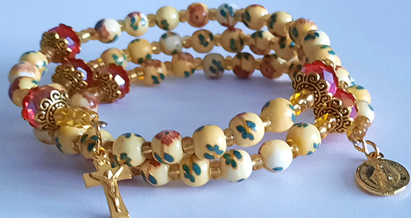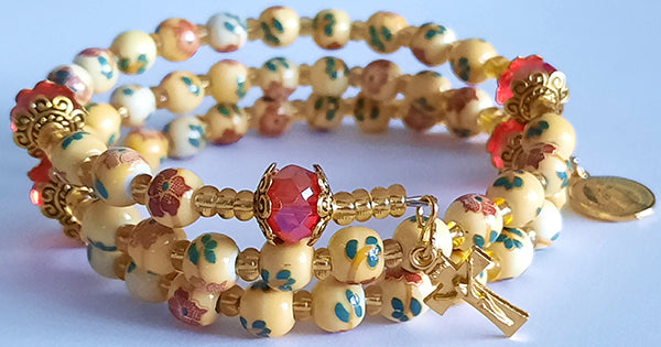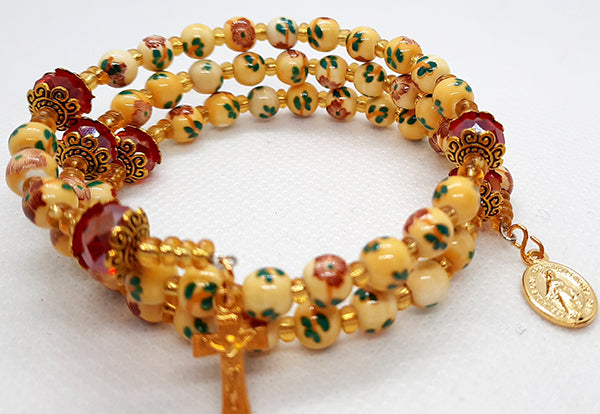 Five Decade Coil Rosary Bracelet - Porcelain - Yellow/Flowers