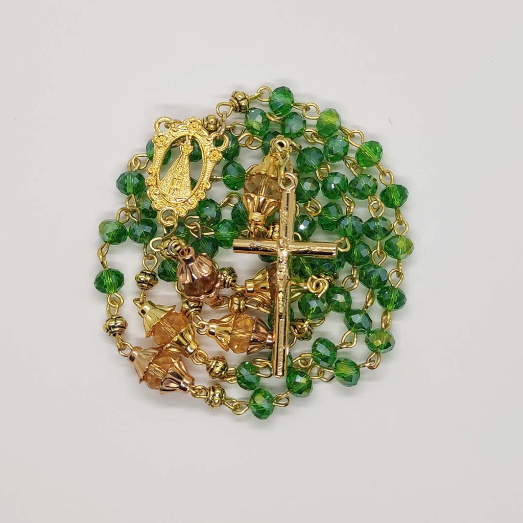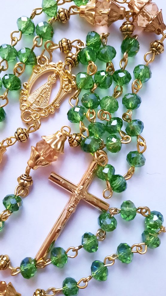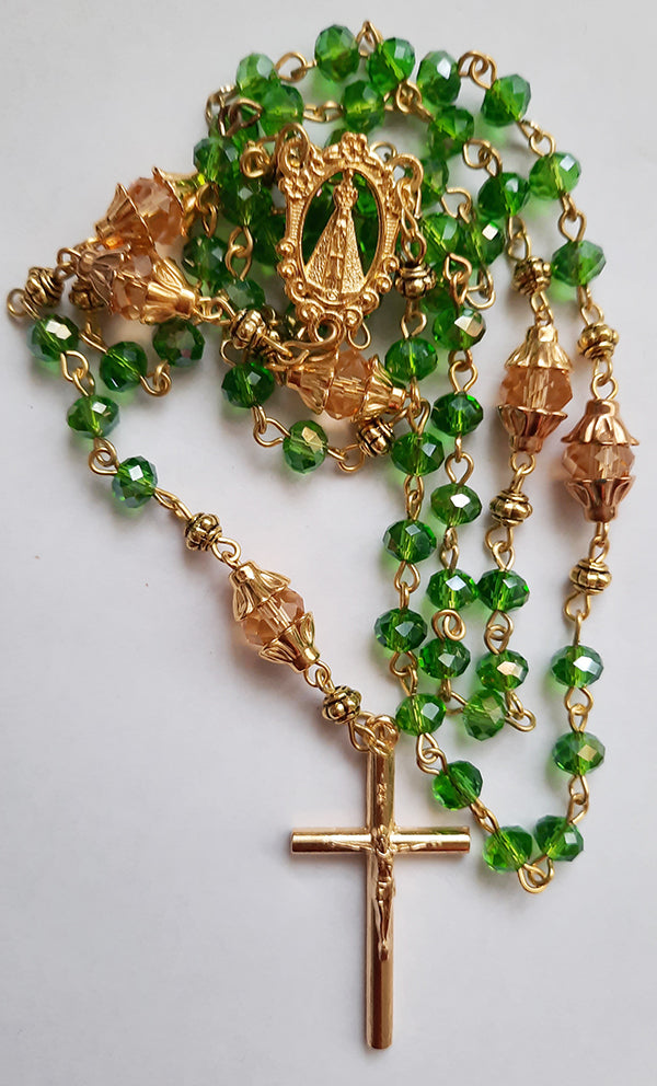 Green glass crystal rosary beads, Lovely handmade Green glass crystal rosary beads, created using gold plated eye pins, a metal centerpiece of the Mother of God and a simple but beautiful crucifix. This is a perfect religious gift for a special occasion like, First Holy Communion, Baptism or Confirmation.