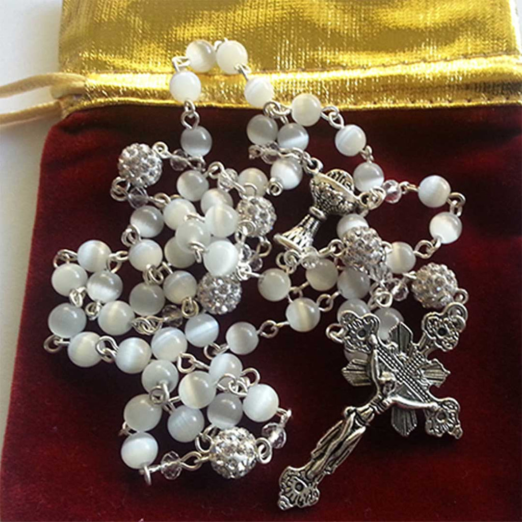 This rosary is made using 6mm white glass cats eye beads for the Hail Mary prayer and 8mm glitter beads for the Our Father prayer.