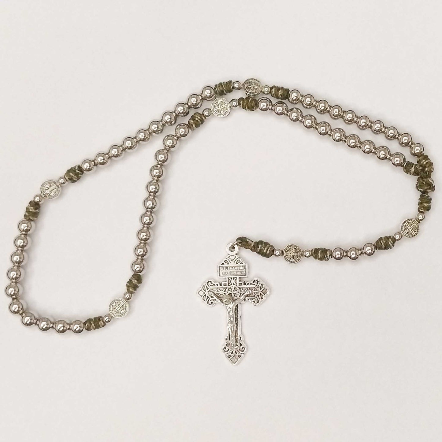 This rosary has a durable base made of micro cord and the solid stainless beads give the rosary a heavy weight. Perfect for a mans rosary.