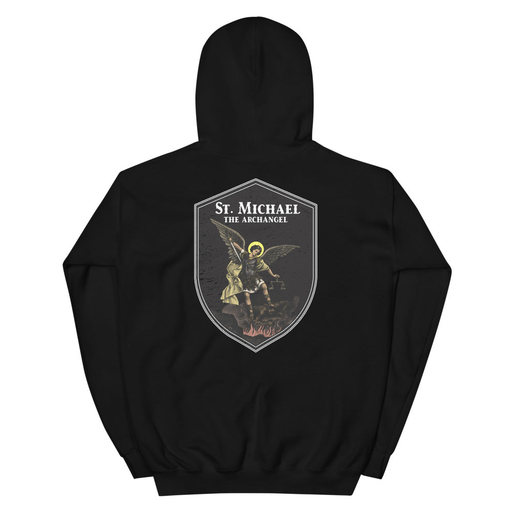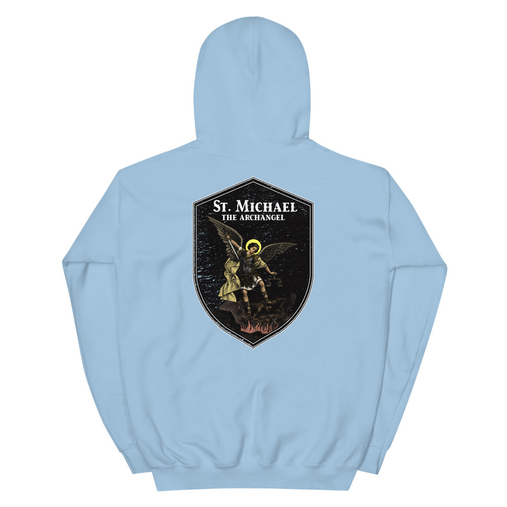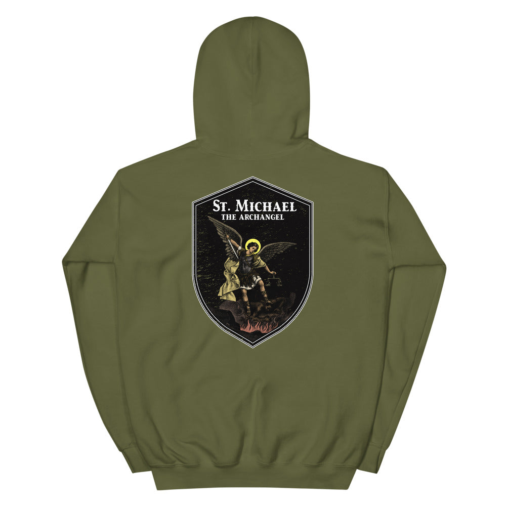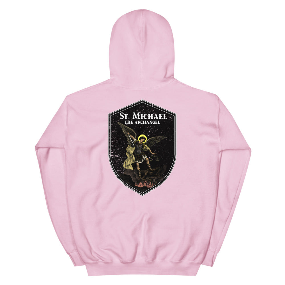 Saint Michael the Archangel fighting the devil as depicted on most prayer cards. Bordered by Shield