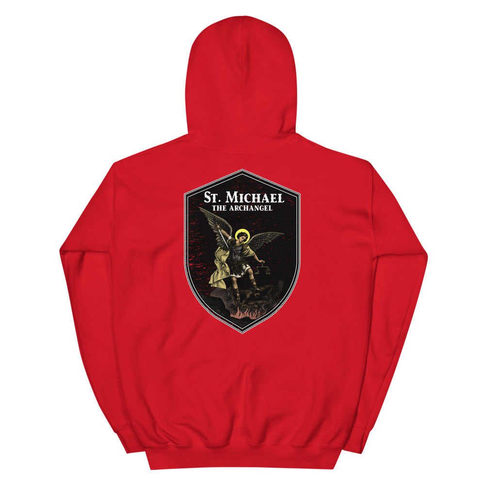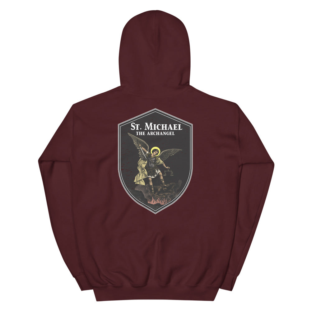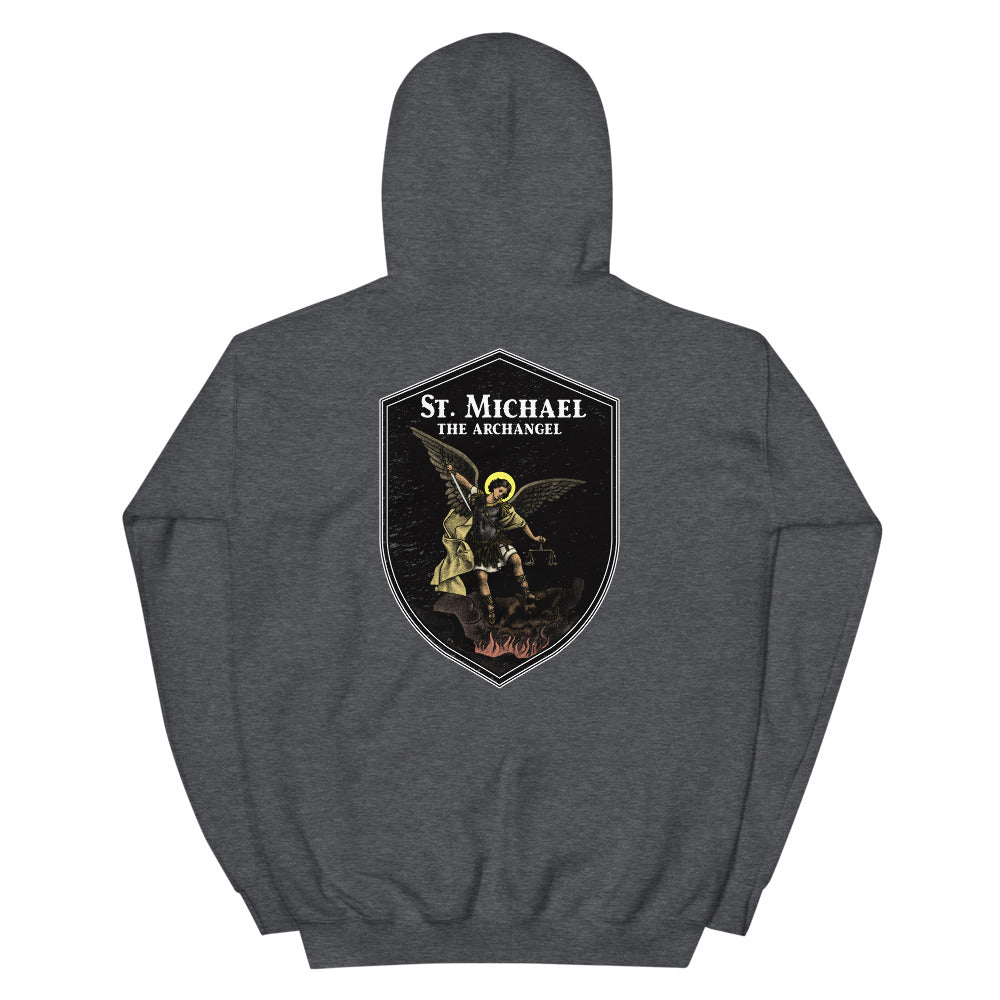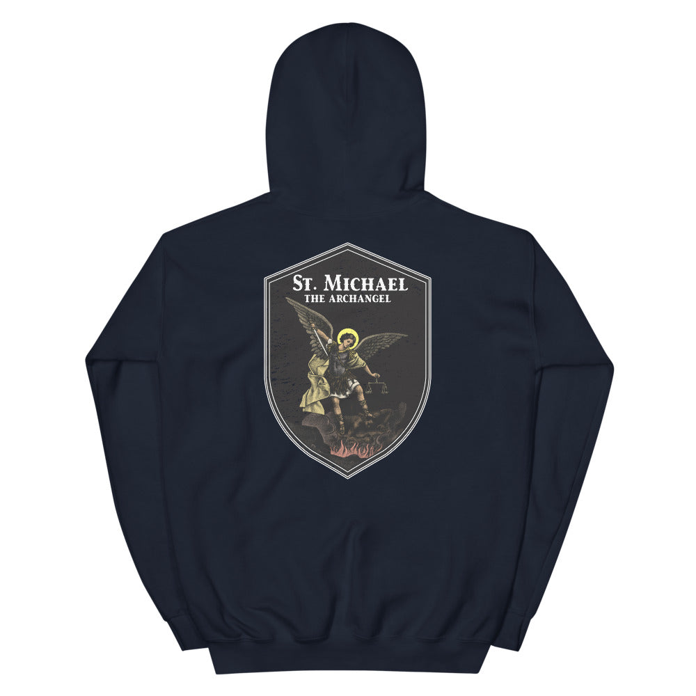 Saint Michael the Archangel fighting the devil as depicted on most prayer cards. Bordered by Shield