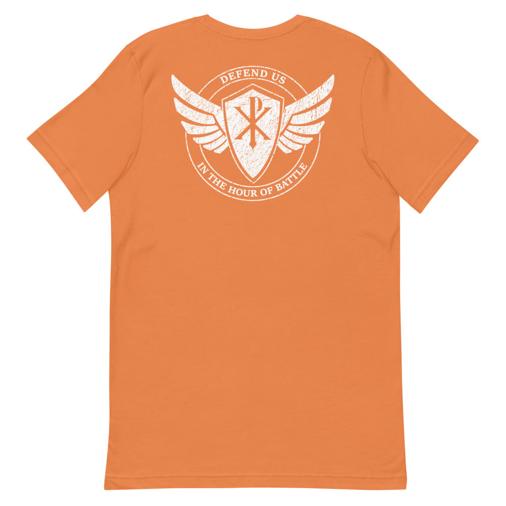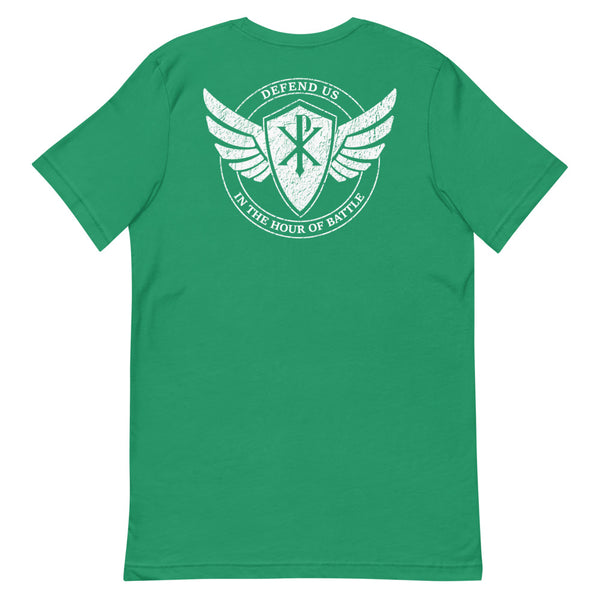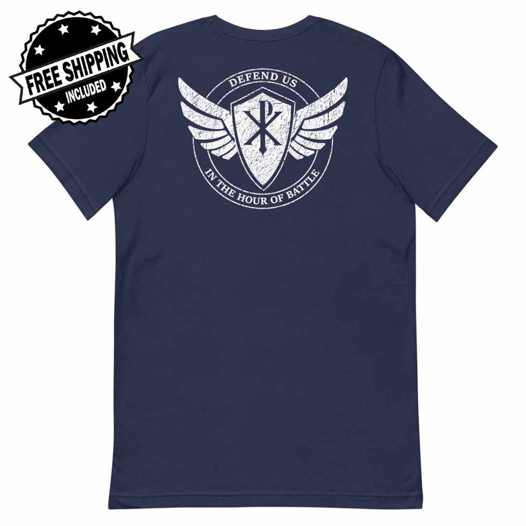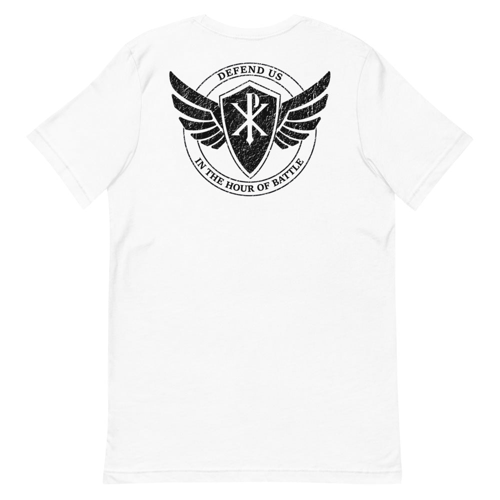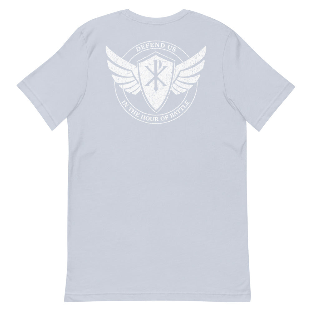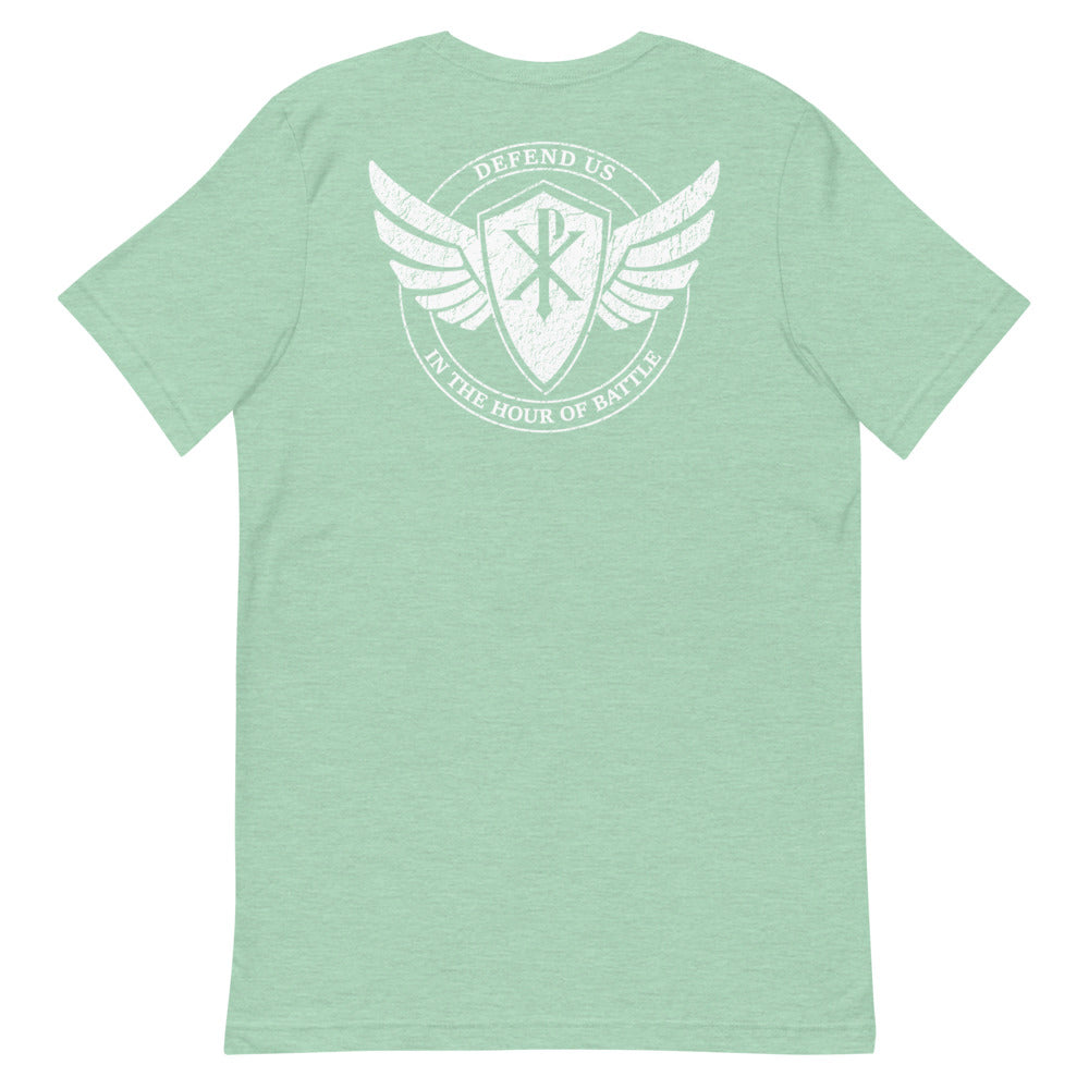 The text is from the Saint Michael prayer “Defend us in the Hour of Battle”