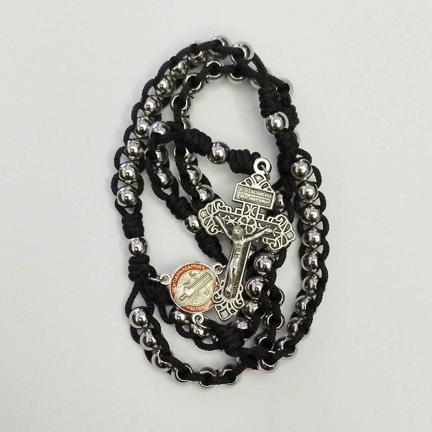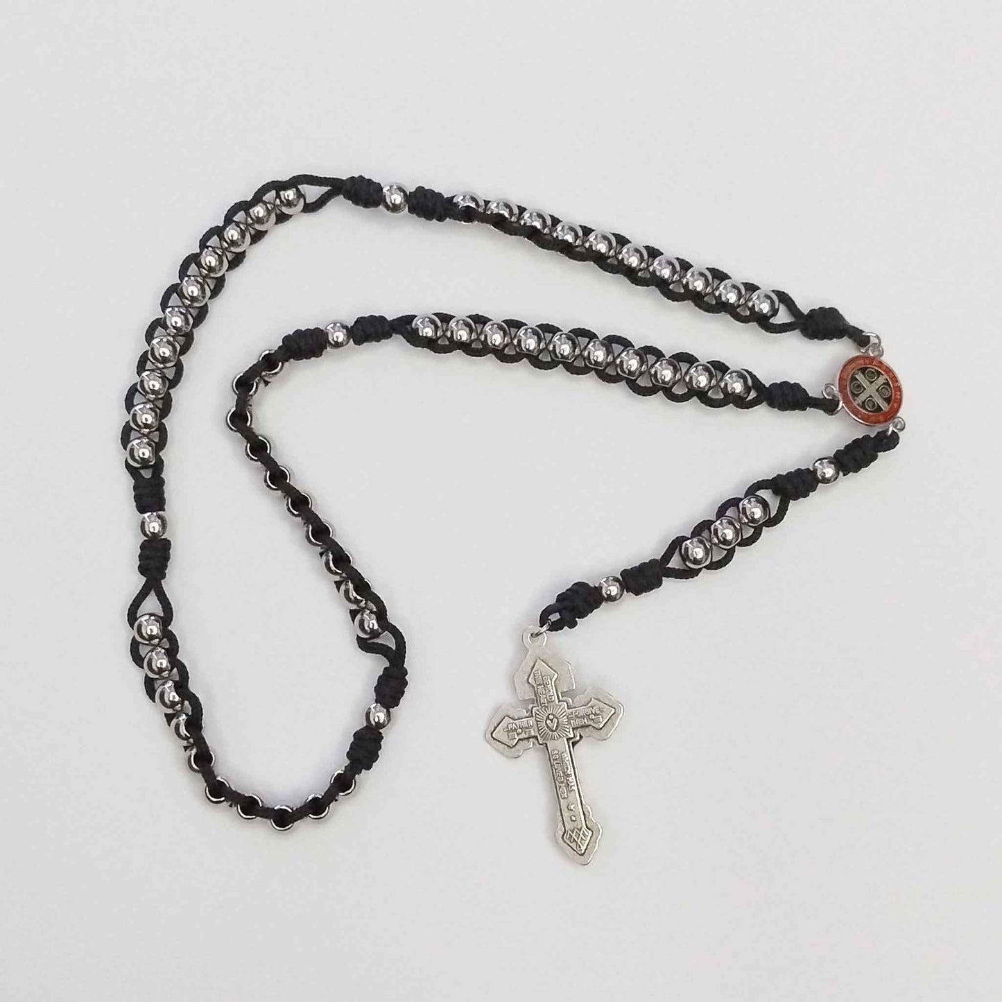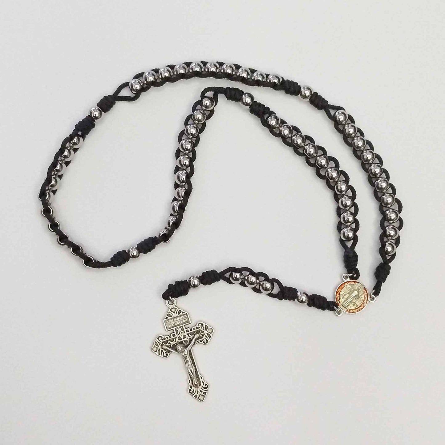 This Slide Rosary is made of 8mm (4mm hole) Solid Stainless steel beads (heavy beads), Pardon crucifix, Saint Benedict centrepiece and Black micro cord.